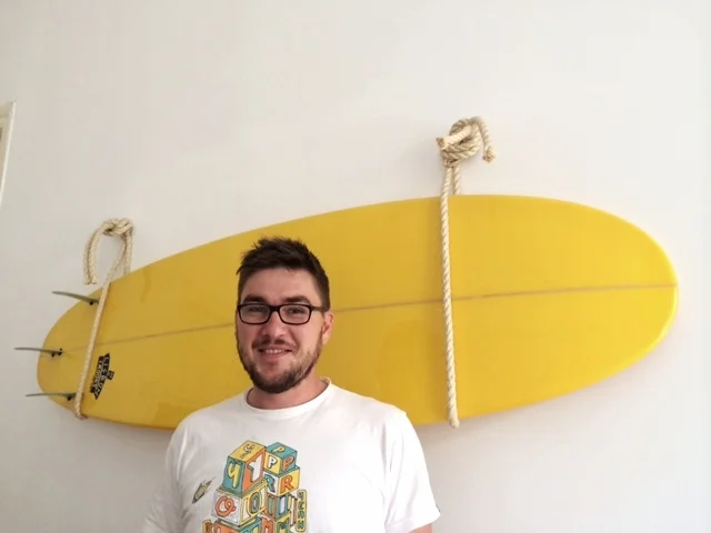 Founder Peter Faber in front of the famous yellow surf board in The Surf Office, Lisbon